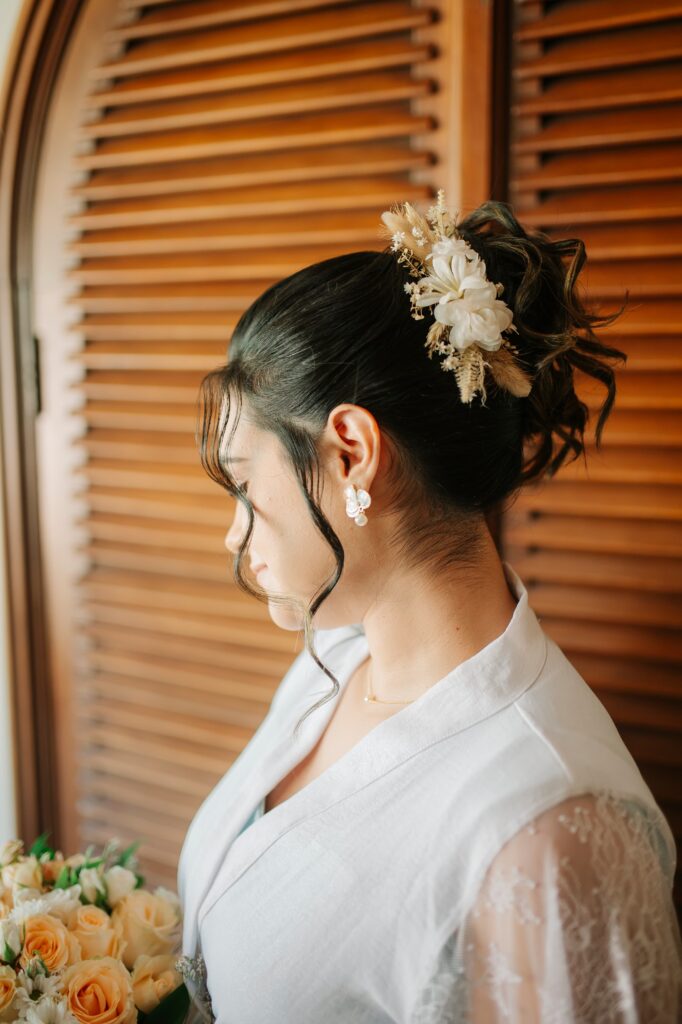Coque com flores ou presilha: Ideal para cabelos curtos.